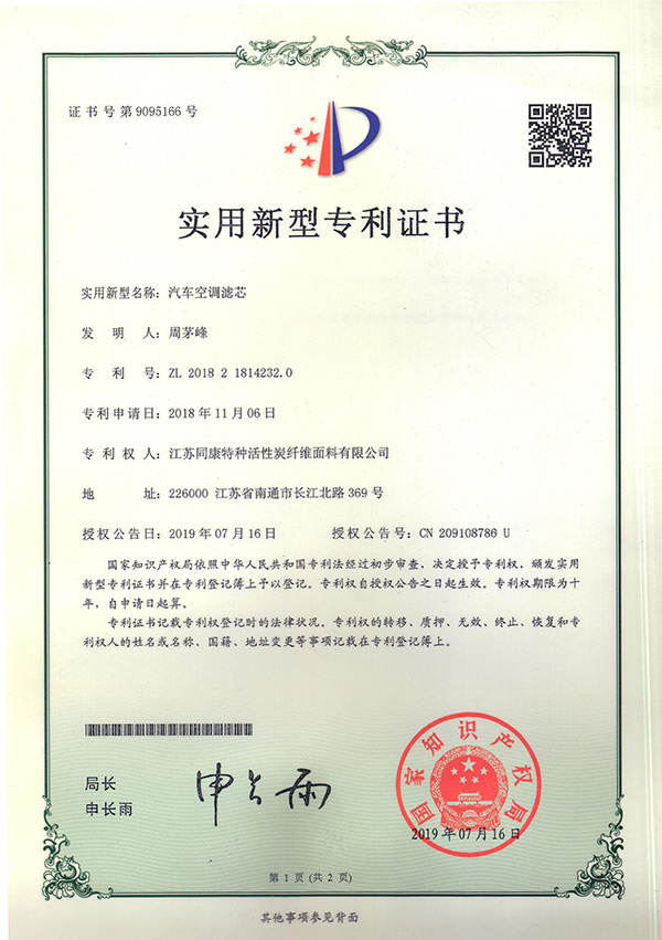 專利證書汽車空調濾芯