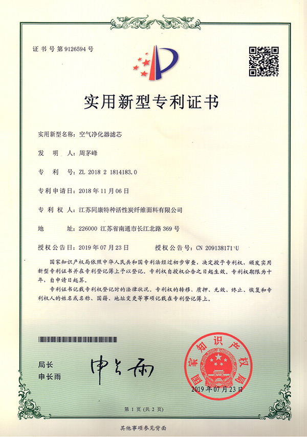 專(zhuān)利證書(shū)空氣凈化器濾芯