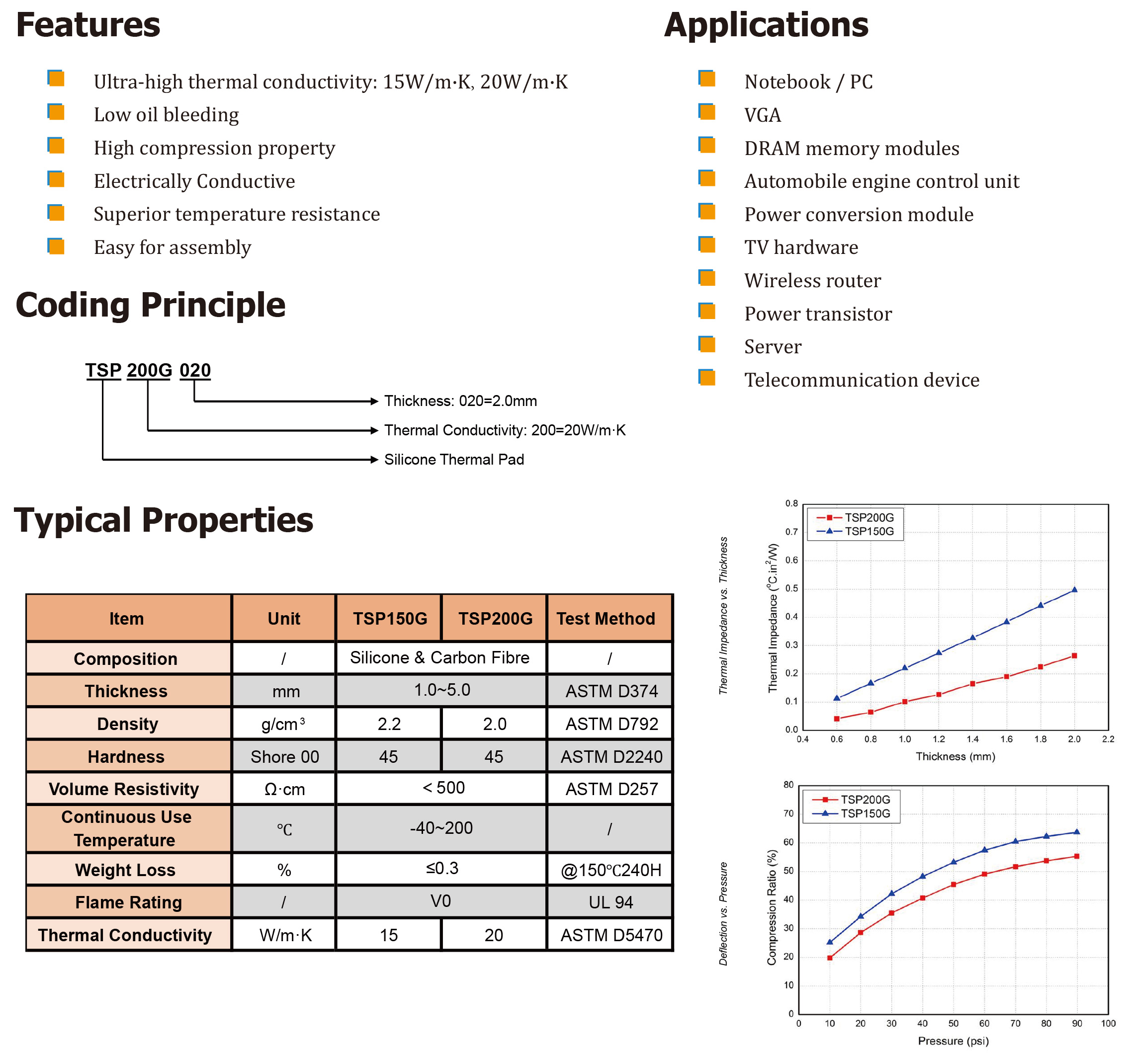 TM TSP-G硅基導熱墊采用高密度碳纖維填充聚合物基體,具有超高的導熱系數,分別為15W/m·K和20W/m·K。還具有高壓縮性、柔軟性和靈活性。" />
