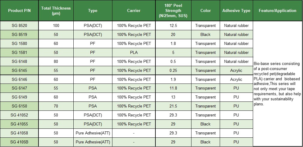 Bio-base系列采用回收的PET(可降解PLA)載體和生物基粘合劑。該系列不但能滿足您的膠帶需求,還能幫助您實現可持續發展計劃。