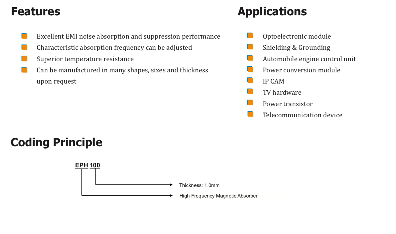 TM EPH系列是一種由高磁導率合金粉末和橡膠混合、分散、壓制而成的高頻吸收材料。該材料可以通過絕緣損耗、磁損耗和阻抗損耗將電子設備發射的電磁波轉化為熱能來減少電磁輻射。" />