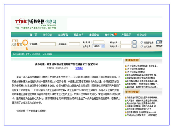 中國(guó)棉紡織信息網(wǎng)、中國(guó)聚合物網(wǎng)——江蘇同康:最新研制的活性碳纖維產(chǎn)品獲得第22個(gè)國(guó)家專(zhuān)利