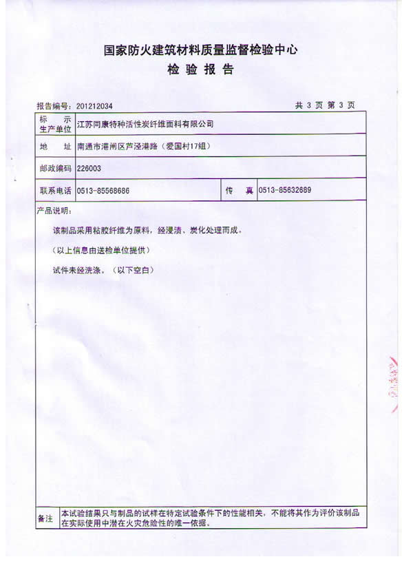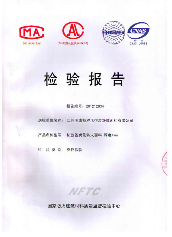 按國家標(biāo)準(zhǔn)GB 20286-2006《公共場所阻燃制品及組件燃燒性能要求和標(biāo)識》判定,我公司研制的粘膠基炭化防火面料燃燒性能符合織物阻燃1級的規(guī)定要求,燃燒性能達(dá)到阻燃1級。該炭化防火面料由粘膠纖維織物為原料,經(jīng)浸漬,炭化處理而成,具有耐高溫、耐明火,無陰燃,無續(xù)燃,無毒無害的特點,具有永久性阻燃功能。